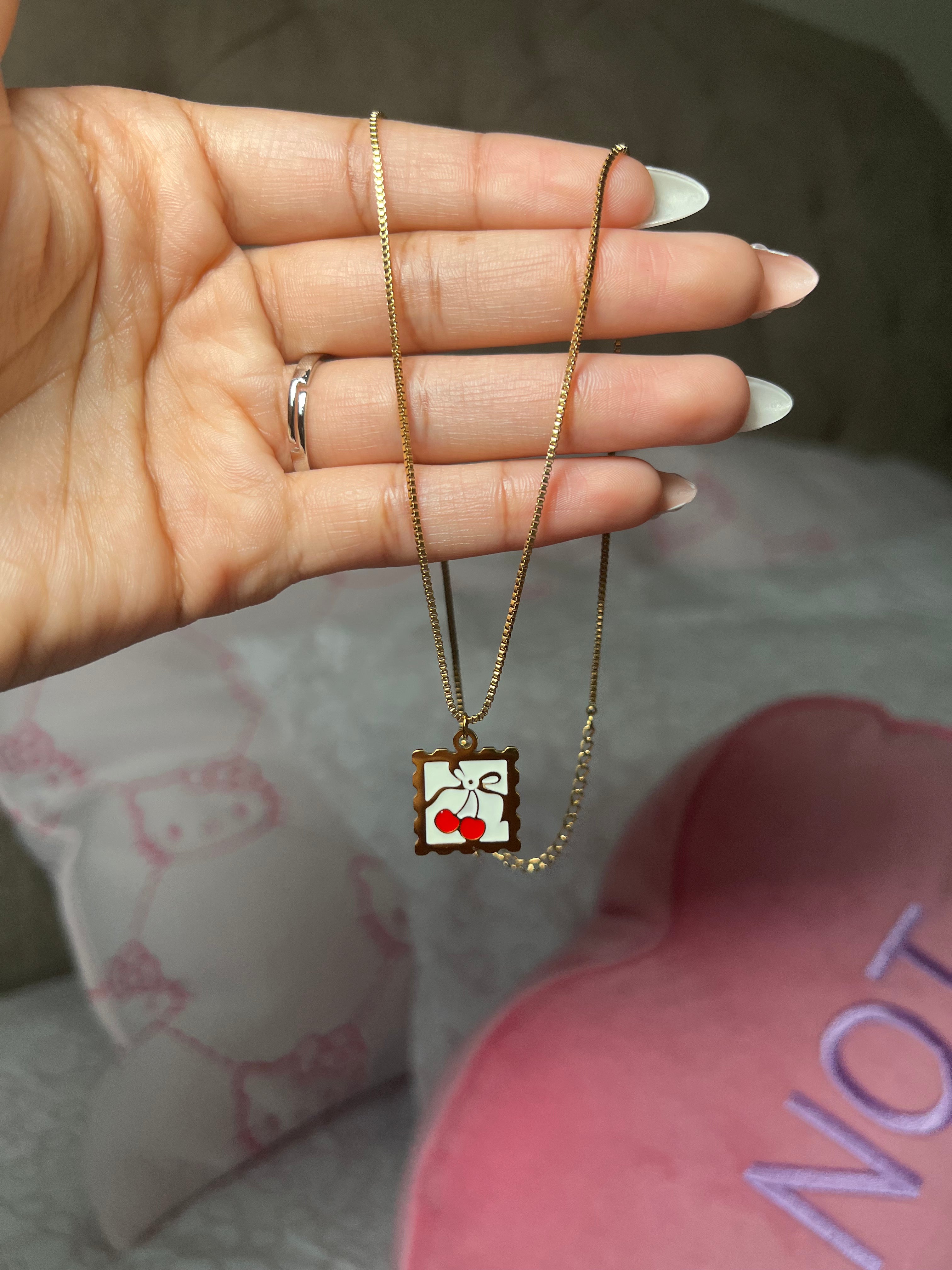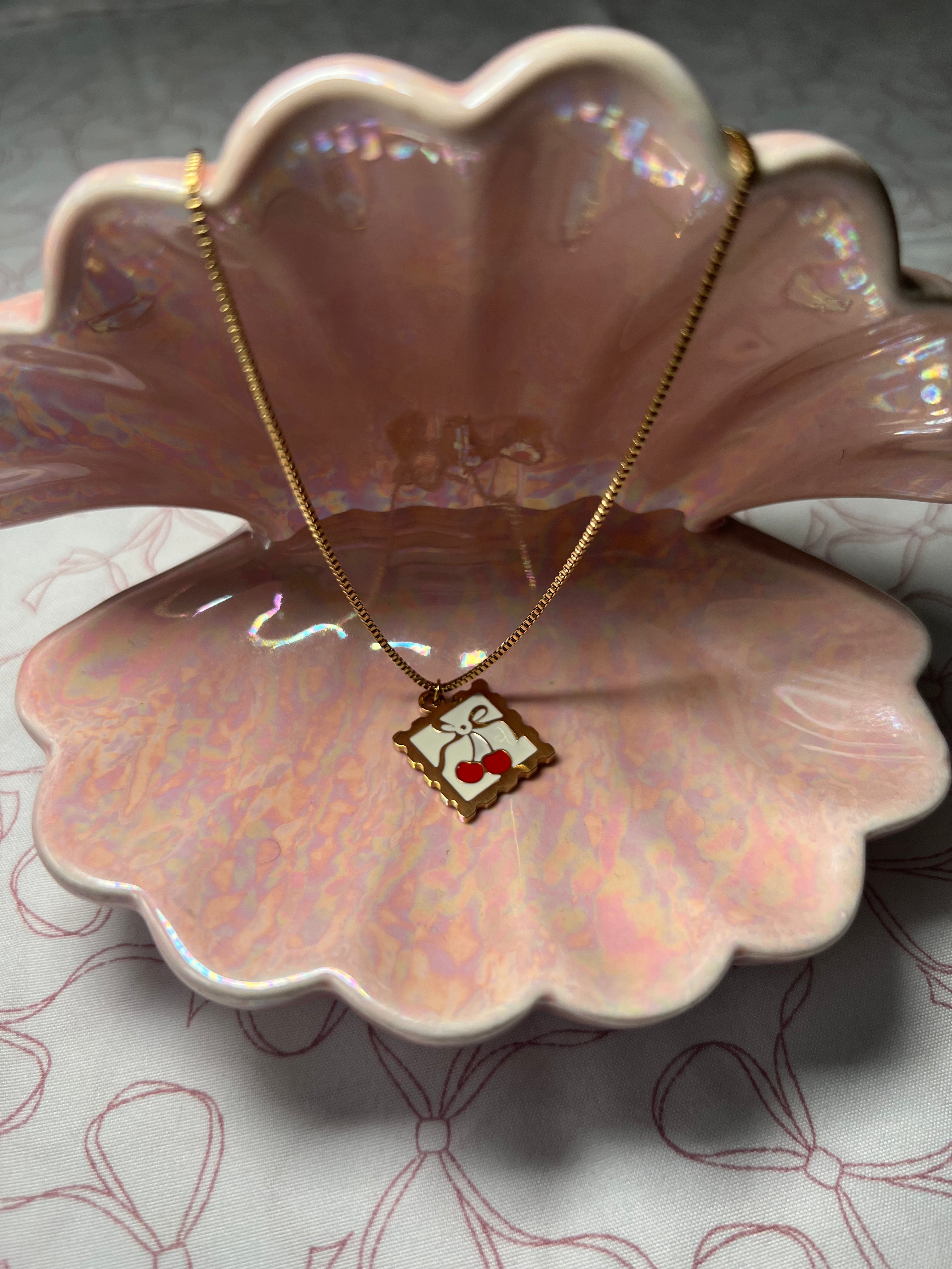 Delicate cherry and bow stamp pendant crafted from premium stainless steel. Designed to resist tarnishing and withstand daily wear, this necklace pairs timeless charm with modern durability. Perfect for layering or wearing solo, it's waterproof and built to last through every adventure.