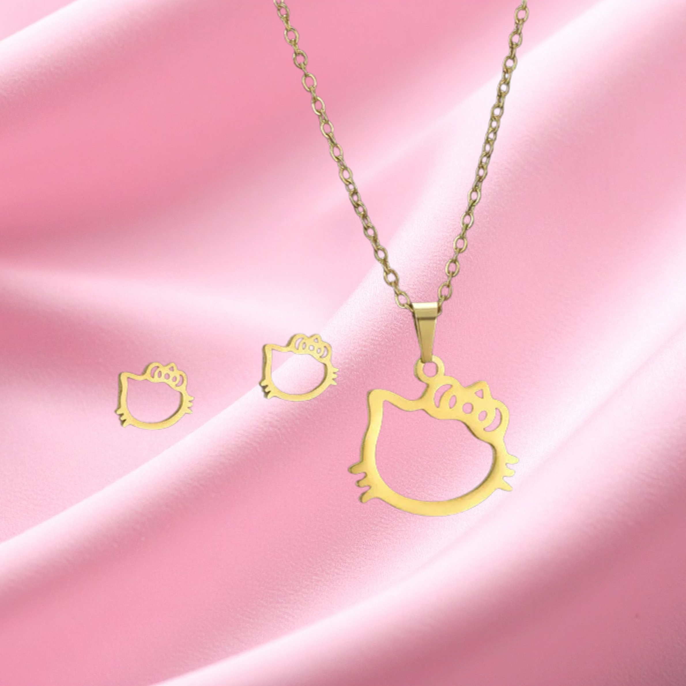 Adorable kitty silhouette pendant necklace paired with matching earrings, both featuring a delicate bow detail. This charming set captures playful elegance in sterling silver or gold-tone finish. Perfect for cat lovers who appreciate whimsical, wearable art. Lightweight and versatile—dress up any outfit or layer with other pieces for a personalized look.