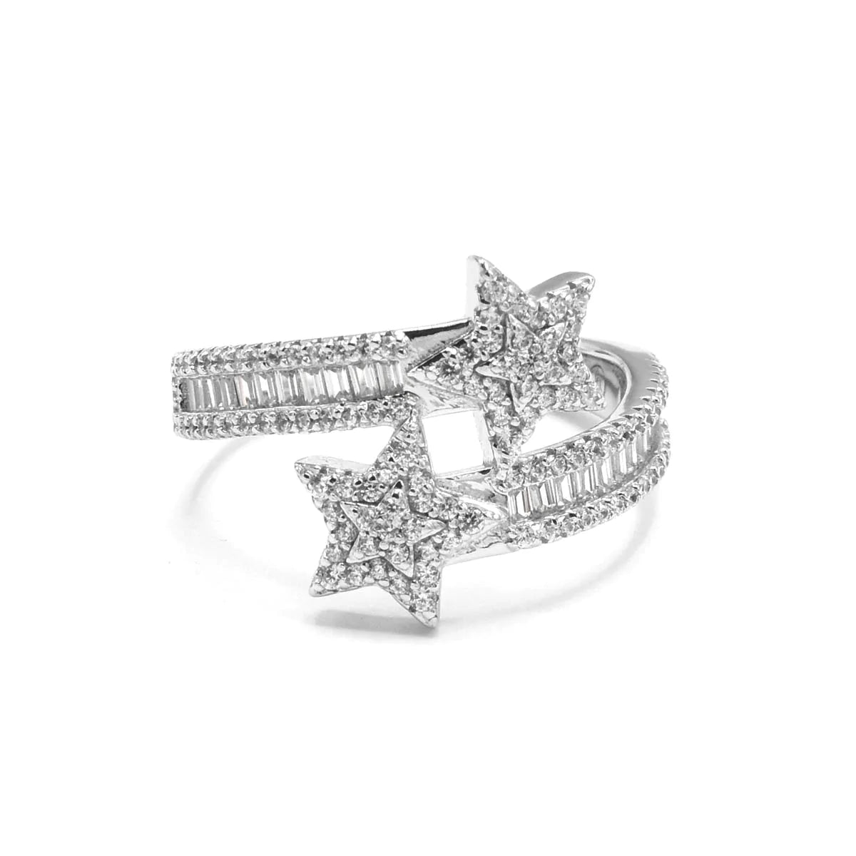 Take your accessory game to the stars with this lustrous Starla Baguette Ring! Crafted from 925 sterling silver, this luxury piece features baguettes and two sparkling stars filled with Cubic Zirconia- perfect for bringing a little sparkle to any look! Plus, no need to worry about tarnish - it won't ever happen! Shine bright and be the star of your own show.